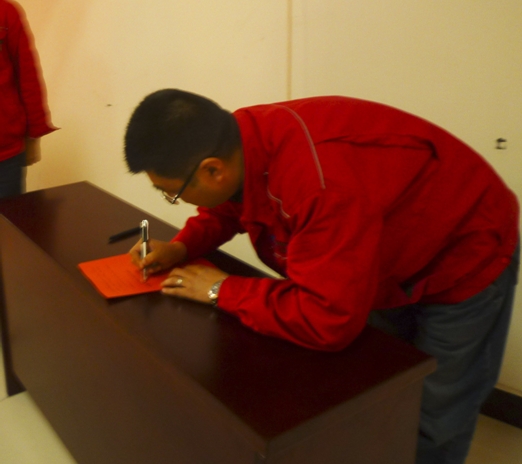 動員大會上各級領(lǐng)導(dǎo)、各車間管理干部、車間班組長上臺進(jìn)行“百日安全大練兵”活動簽字儀式。